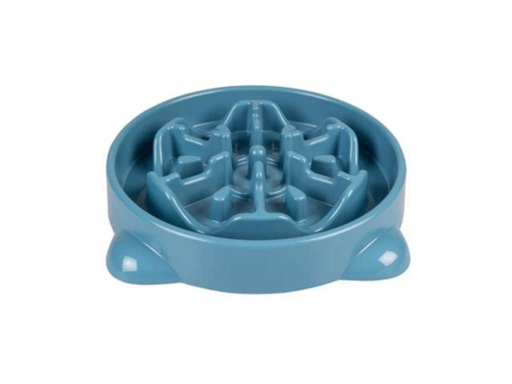 Niektoré psy dokážu jedlo extrémne rýchlo hltať. Granule, alebo inú potravu do seba nasúkajú kým sa stihnete otočiť. Z takéhoto rýchleho jedenia potom môžu mať tráviace problémy. Spomaľovacia miska môže tento problém vyriešiť. Je tvarovaná tak aby vo vnútri vytvárala menšie bludisko a teda pes granule nevie z misky hltať. Pri jedení ho dolovanie granúl z rôznych škárok a priehlbiniek dostatočné spomalí, aby svoju porciu nezhltol za 2 sekundy.