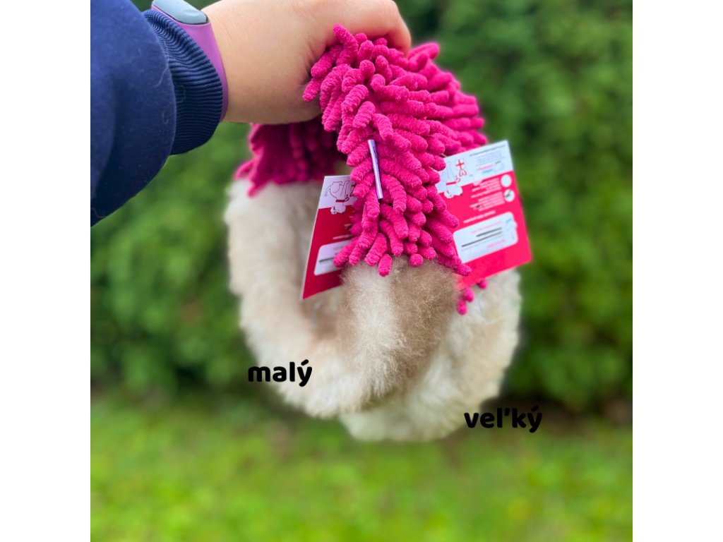 Starostlivosť o hračku: Vplyvom psích slín môže hračka zvlhnúť. Hračku nie je možné prať v práčke. Je potrebné ju nechať len prirodzene uschnúť a prečesať kovovým hrebeňom. Mop môžete vyčistiť pod vodou, ale dajte pozor aby nezmokla aj kožušinka.