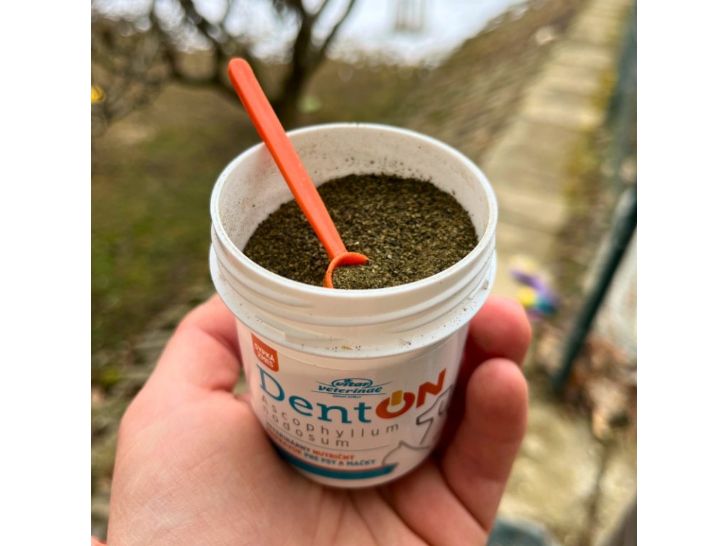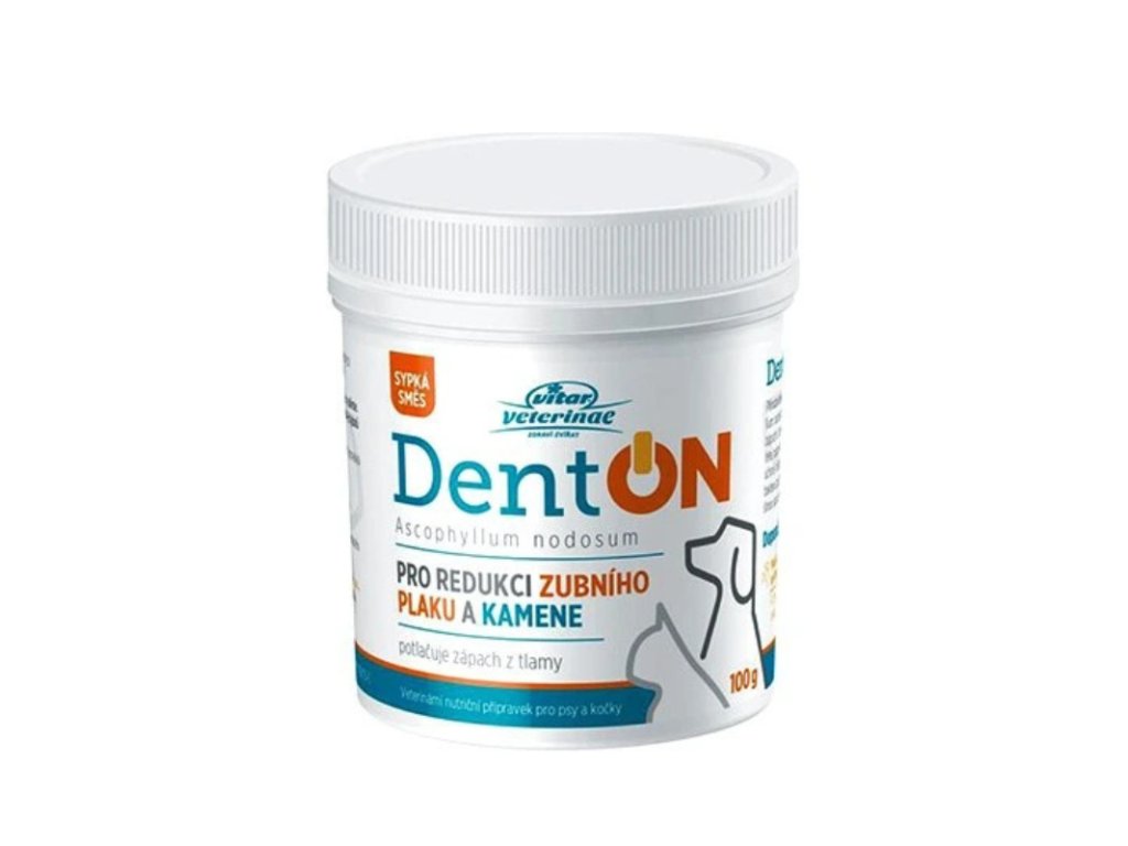 Prírodný prípravok Denton obsahuje morskú riasu Ascophyllum nodosum, ktorá výrazne pomáha redukcii zubného povlaku a kameňa, navyše znižuje zápach z tlamy psov a mačiek. Preparát pôsobí priamo v zažívacom trakte zvieraťa, odkiaľ sa následne dostáva do krvného riečišťa, potom do slín a tým veľmi účinne pôsobí na zuby a ďasná.